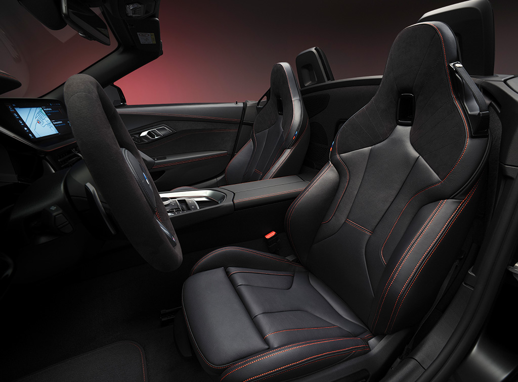 Inside the cabin, BMW highlights the Z4’s dynamic character through red contrast stitching across the instrument panel, centre console, door panels, and M Sport seats upholstered in Vernasca Leather and Alcantara. An M Alcantara steering wheel with matching stitching reinforces the cockpit’s performance intent, while engraved door sills mark the exclusivity of this special edition.